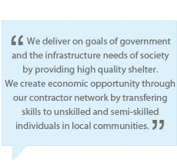 Focus on social infrastructure. While the technology we use is applicable in the commercial market, we are passionate about providing social infrastructure in a sustainable manner. We help create jobs, transfer skills and deliver on the needs of the continent.